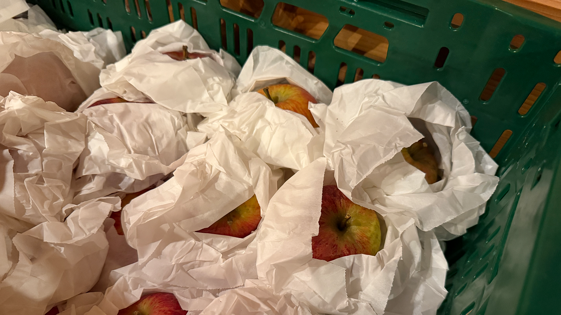 Eine bewährte Methode ist das Einwickeln der einzelnen Äpfel in Papier. Ideal dafür ist Zeitungspapier. Da nun aber immer weniger Zeitungen gedruckt bzw. gekauft werden und ein Tablet schlecht zum einwickeln von Früchten geeignet ist, können das gute alte Butterbrotpapier oder Butterbrottüten aus Papier – verfügbar in jeder Drogerie – Abhilfe schaffen.