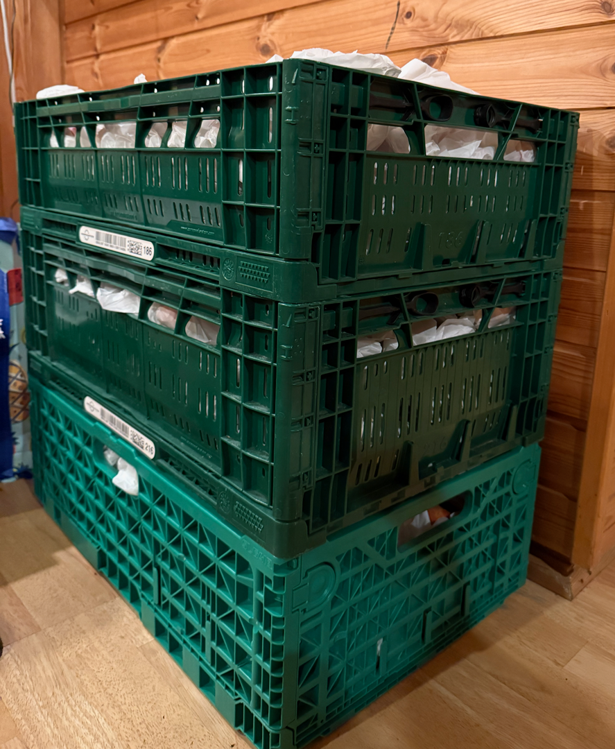 Lagerung in stapelbaren Plastik- oder Holzkisten