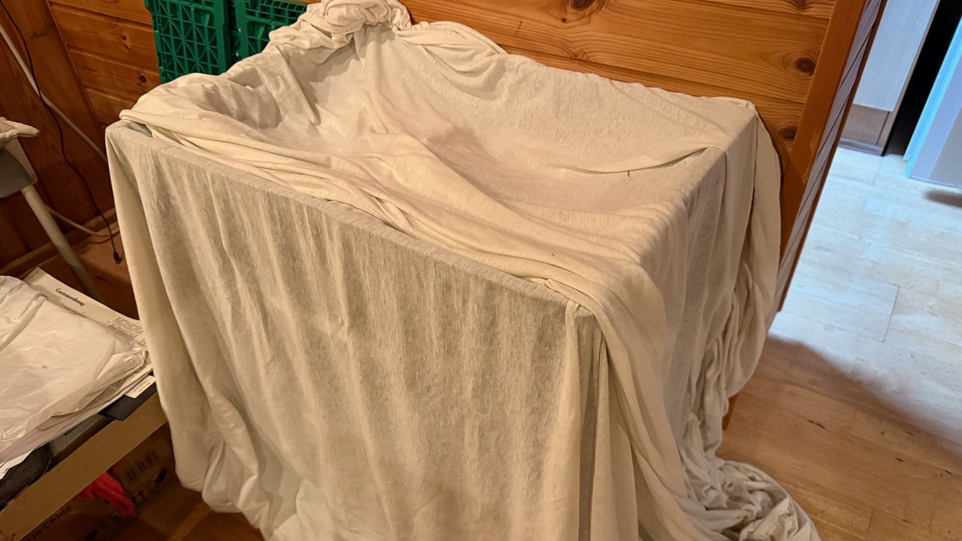 Ein längerer Kälteeinbruch mit zweistelligen Minusgraden hat uns dazu veranlasst einen kleinen Bereich unserer Laube – in dem auch zwei Oleanderbüsche überwintern und ein paar Getränkekisten vom letzten Vereinsfest stehen – abzuteilen und mit einem Frostwächter auszustatten. Nur wegen der Äpfel hätten wir es drauf ankommen lassen, aber die Pflanzen wollten wir schützen. Dies ist also keine Empfehlung, sondern mehr eine Lageranekdote.