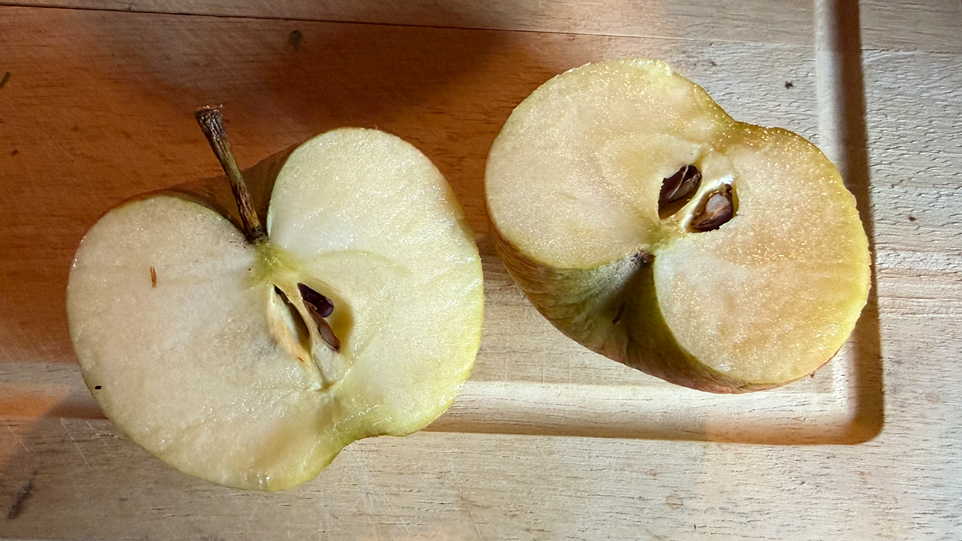 Es ist Mitte Dezember und unsere Äpfel sind nach wie vor frisch und lecker. Sie sind nicht mehr ganz so knackig wie frisch vom Baum, aber noch weit entfernt von mehlig. Natürlich kommt das auch auf die Sorte und ihre individuelle Lagerfähigkeit an. Da uns die Apfelchips langsam knapp wurden, haben wir weitere Äpfel aus dem Garten geholt und mit wunderbar aromatischem Ergebnis getrocknet.
