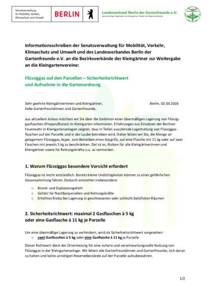Der Landesverband Berlin der Gartenfreunde e. V. informiert zusammen mit der Senatsverwaltung für Mobilität, Verkehr, Klimaschutz und Umwelt über die Gefahren einer übermäßigen Lagerung von Flüssiggasflaschen (Propan/Butan) in Kleingärten.